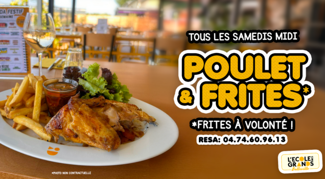 Tous les samedis midi à L’école des grands – Belleville, viens te régaler autour d’un poulet frites convivial et gourmand.