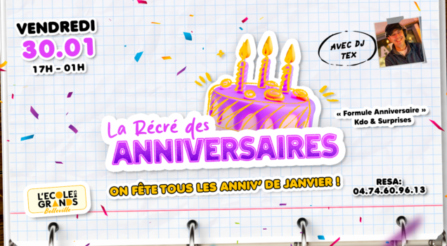 Le vendredi à L’école des grands – Belleville, viens célébrer ton anniversaire (ou celui de tes proches) dans une ambiance festive et conviviale. Musique, danse et bonne humeur au rendez-vous pour souffler les bougies et faire la fête tous ensemble !