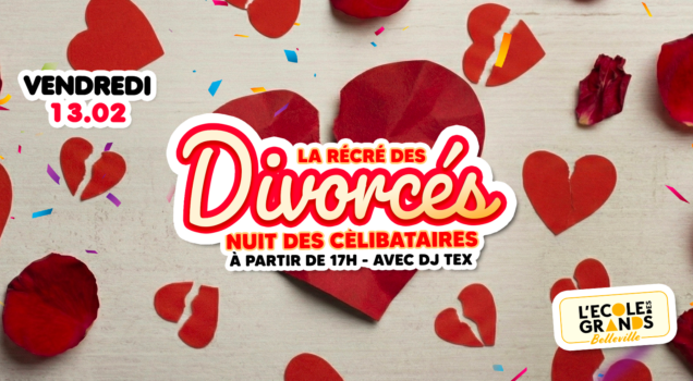 Le vendredi à L’école des grands – Belleville, viens danser, rencontrer et t’amuser ! La Récré des Divorcés, c’est la soirée des cœurs libres animée par DJ Tex pour une ambiance festive et conviviale.