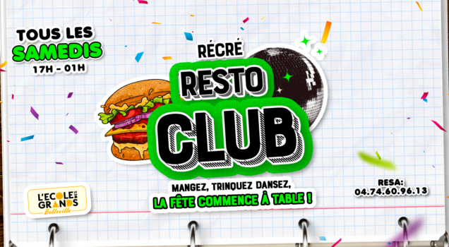 Le samedi à L’école des grands – Belleville, viens partager un dîner gourmand et convivial avant de profiter d’une soirée festive. Entre amis, en duo ou en groupe, la fête commence à table et continue sur la piste de danse !