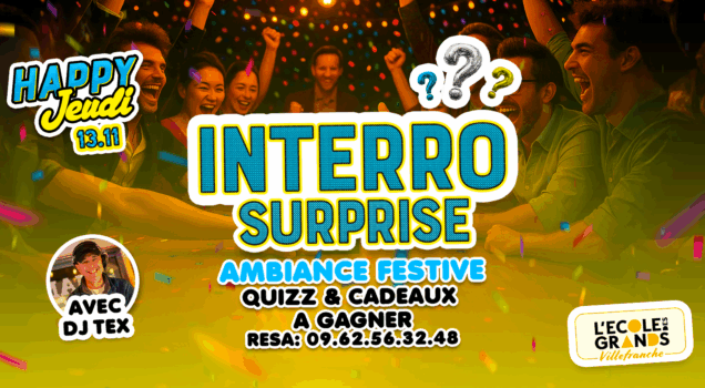 À l’École des Grands, rejoins-nous pour le Happy Jeudi « Interro Surprise » : quizz, blind test et cadeaux à gagner, le tout dans une ambiance conviviale et musicale avec DJ TEX !